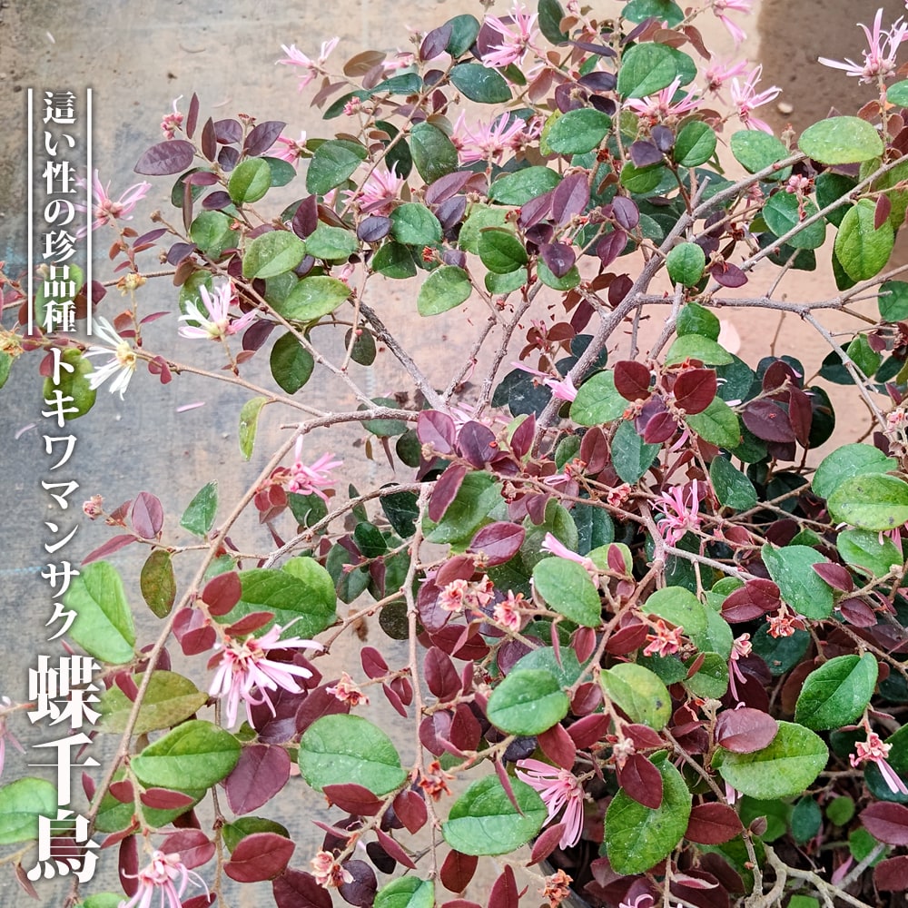 樹形が這性になる珍品種です。初夏に中輪の桃花が楽しめます。