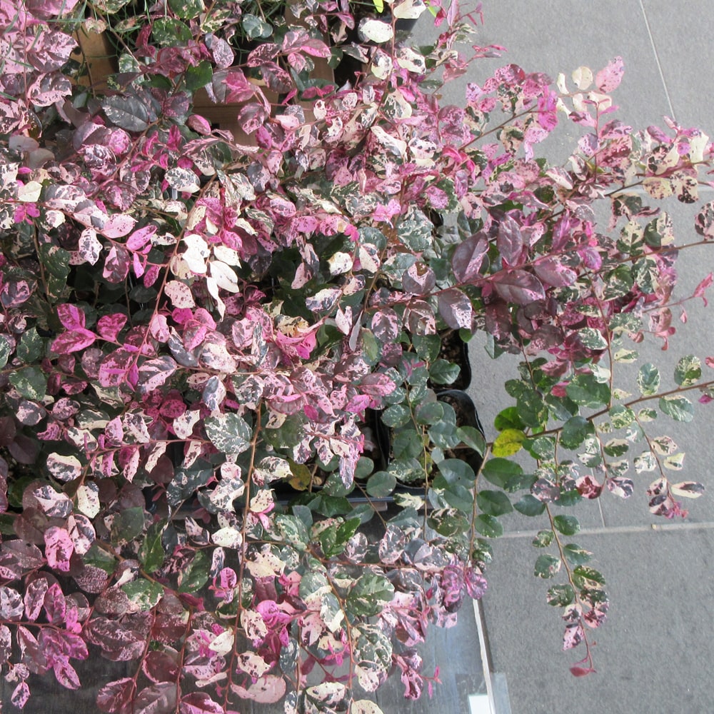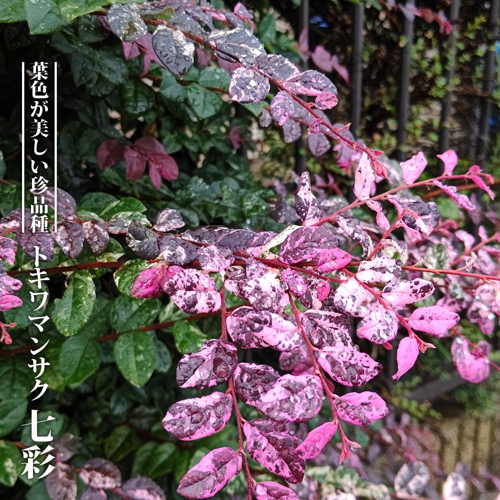 緑葉に白散斑、さらに秋に桃色や紫色などの斑が出る美葉品種で、一年を通じて葉色の移り変わりが楽しめます。春に咲く紅い花も見ごたえありです。
