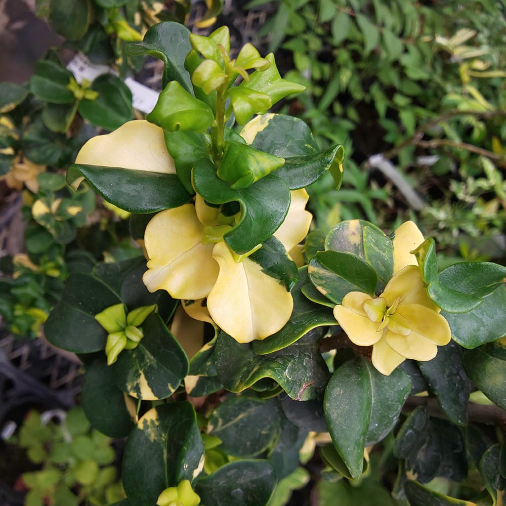 フクラモチはネズミモチの変種で、福が来る縁起の良い木です。葉は丸く密生します。葉の縁が波状に反り返ります。不規則な斑が入る斑入りフクラモチです。