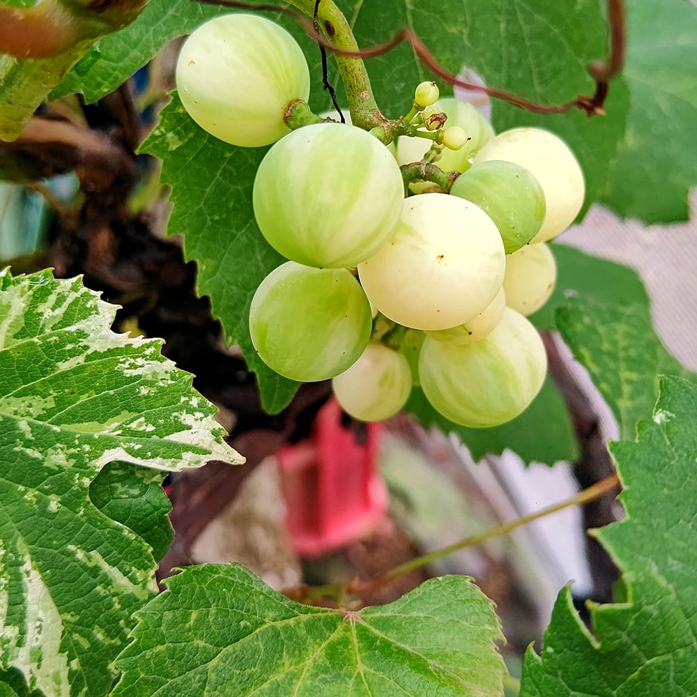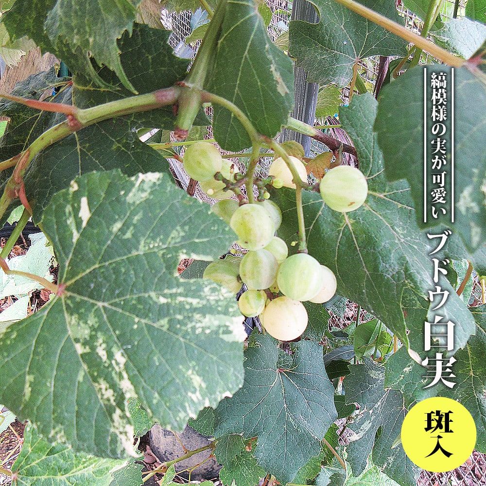 斑入り葉の観賞用のぶどう。白い果実にも縞模様の斑が入ります。果実は食べれるようですが、まだ食べたことがないので味はわかりません。フェンスやアーチに誘引してもおしゃれです。