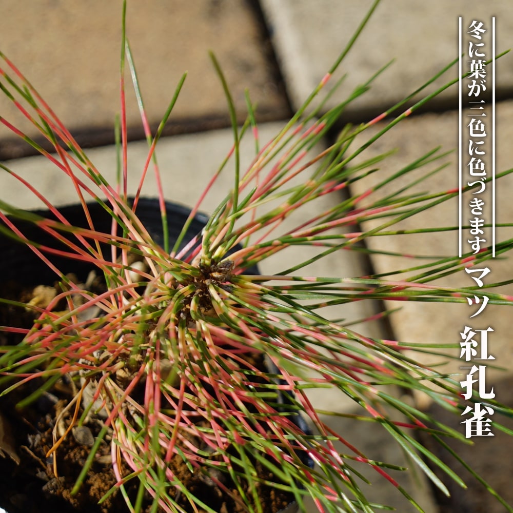 紅孔雀は葉に白から~クリーム色の斑が入る松で、明るく風雅な美しさがあります。寒さに当たると斑が赤く紅葉し、黄色・緑・赤を染め分けたような鮮やかな葉色が楽しめる美葉品種です。横に伸びやすく味のある樹形になるため、盆栽に仕立てても好適です。斑の入り方はやや個体差があります。赤松と黒松の中間種で合黒松といわれるとても珍しい品種です!