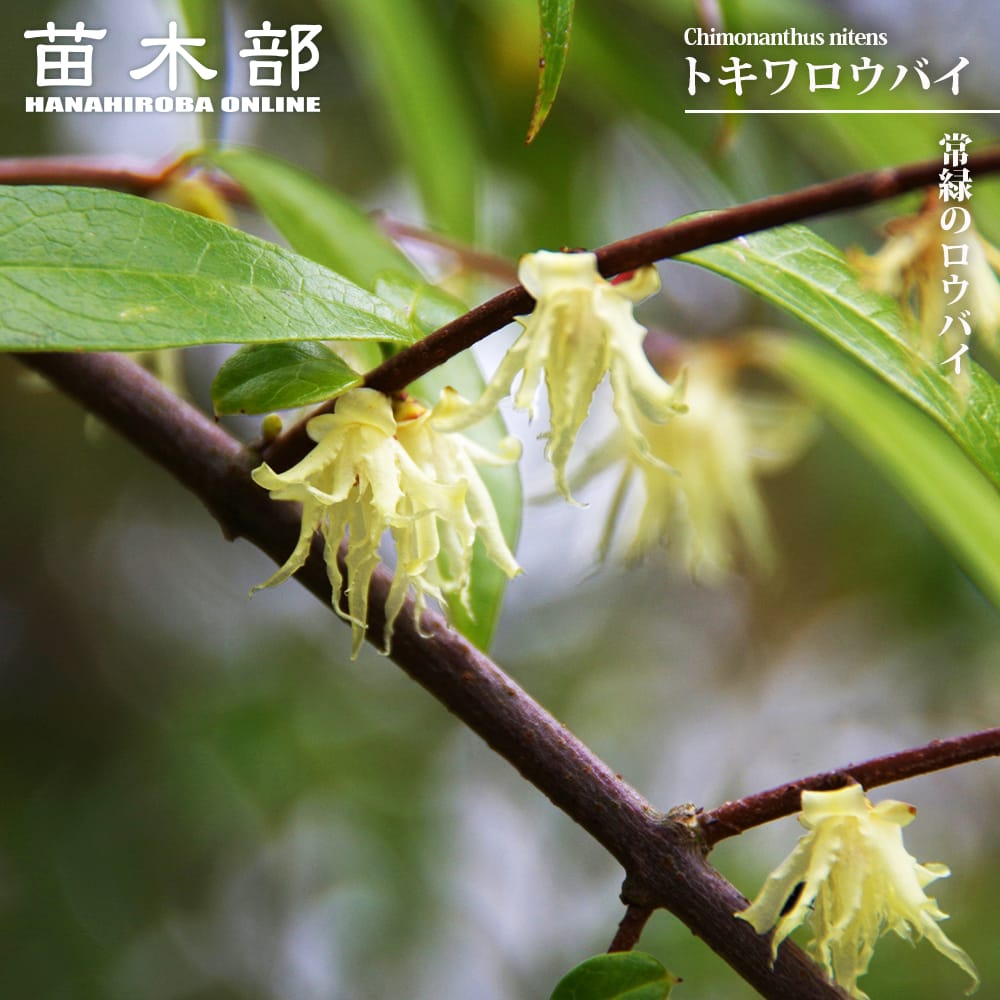 「トキワロウバイ」は常緑タイプのロウバイです。蝋細工のようなクリーム色がかった花を咲かせ、ロウバイよりも早く開花します。花は下向きに咲き、あまり目立ちません。