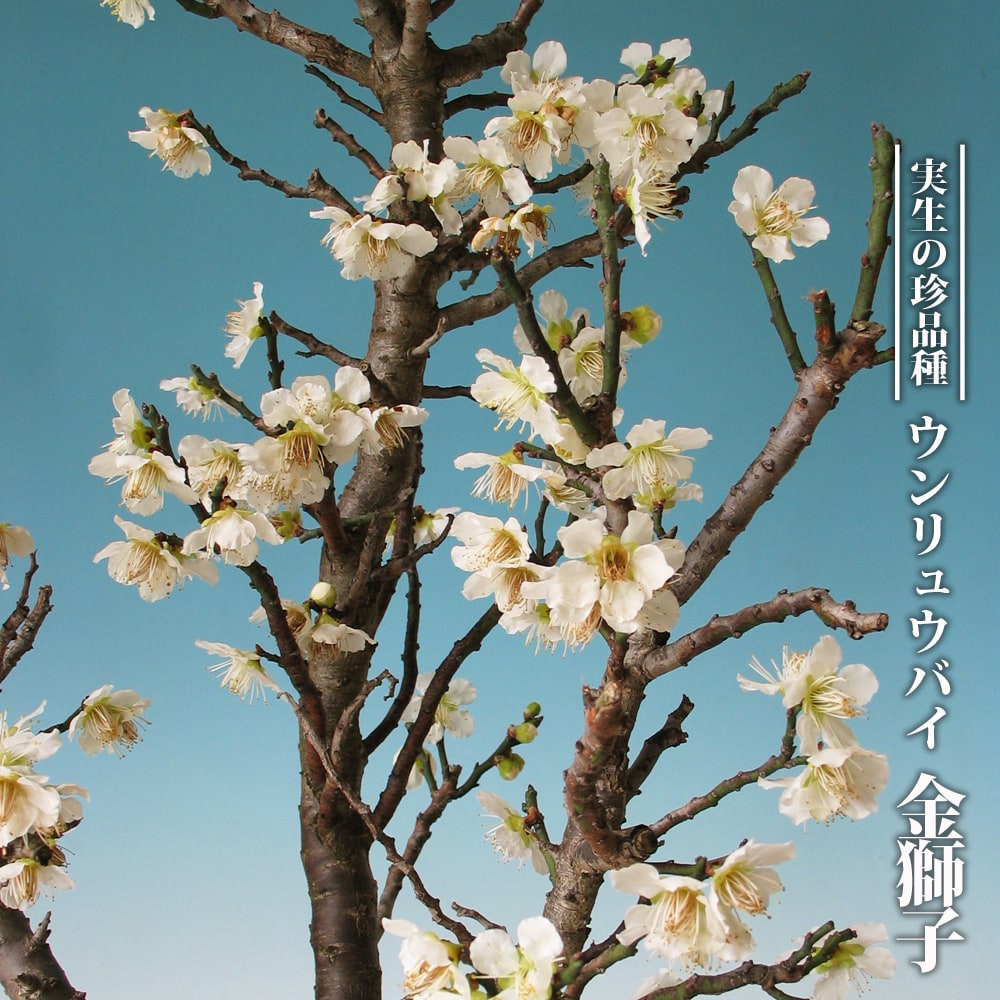 金獅子(きんじし)は青軸性の枝が独特な形で短いのが特徴です。普通の梅よりも早く咲くので、一足先に春の訪れを楽しむ事ができる花木です。雲竜梅(うんりゅうばい)とも呼ばれます。