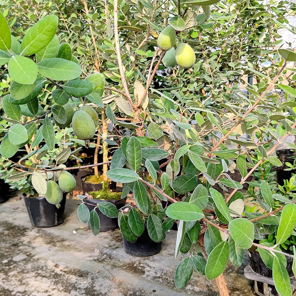 フェイジョアは常緑で魅力の多い果樹です。枝の色が茶色。葉が丸く照り葉で葉の裏はシルバーがかっています。葉色と枝の茶色のコントラストが美しいです。小さめですが、エキゾチックな南国風の花が咲いて花は食べれるエディブルフラワー。病害虫はほとんどつかず、果実が実ります。塩害に強いので海岸側でも育ちます。強い剪定にも耐えますので生垣や目隠しにも使えます。