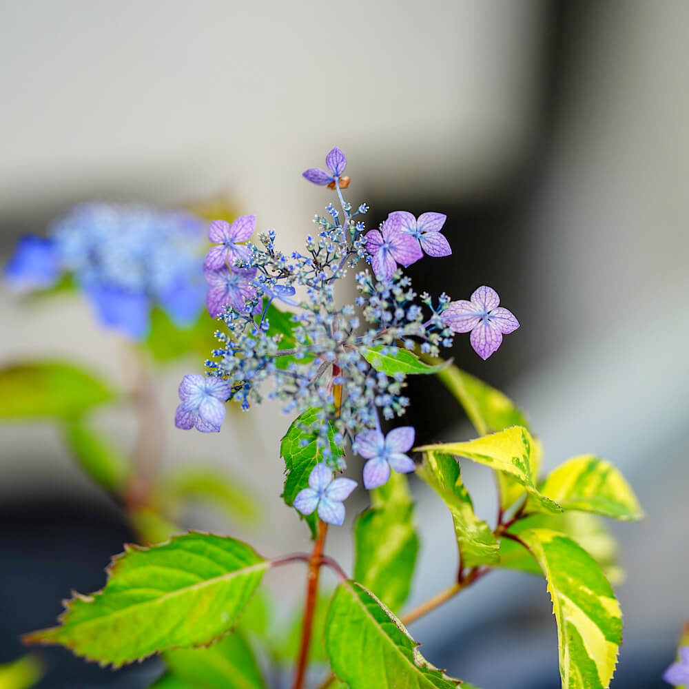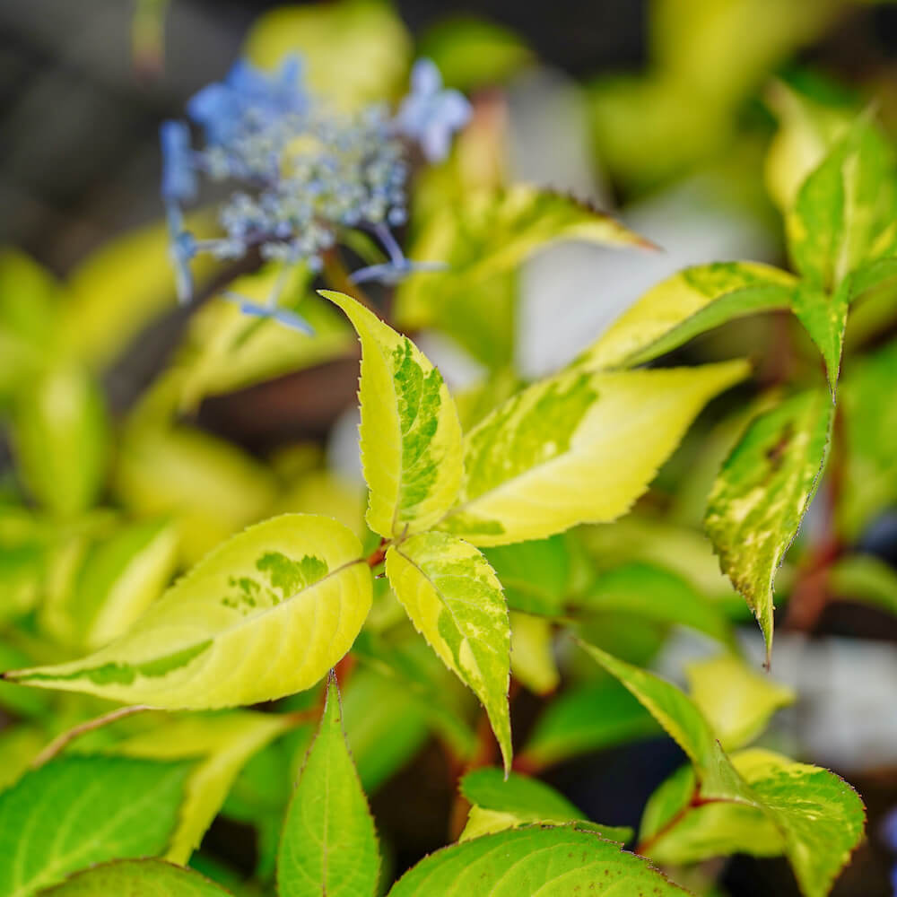アジサイ「藍姫(あいひめ)」の葉にフクリン斑が入った美葉品種です。藍姫は、アジサイの中でも暑さに強い強健な品種のようですが、「斑入り」は少し性質としては弱くなるため、普通のアジサイと同じように、夏の直射日光を避けてあげたほうが無難でしょう。