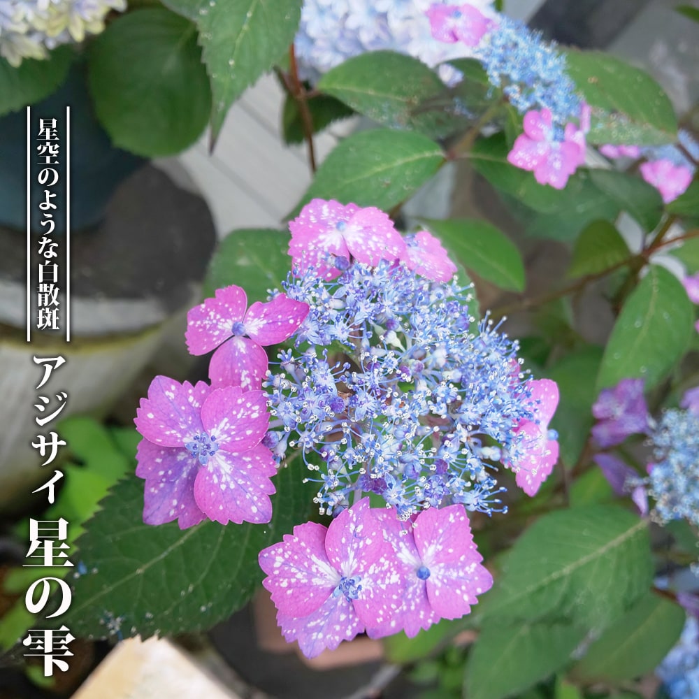 星の雫(ほしのしずく)は青紫色のガクに白く細かなスポットが入る今までにない花模様がとても特徴的な品種です。花全体がまるで星空のような幻想的な雰囲気で、ヤマアジサイのナチュラルな感じと合間って大変魅惑的な品種です。生産量がとても少ないレア品種です。