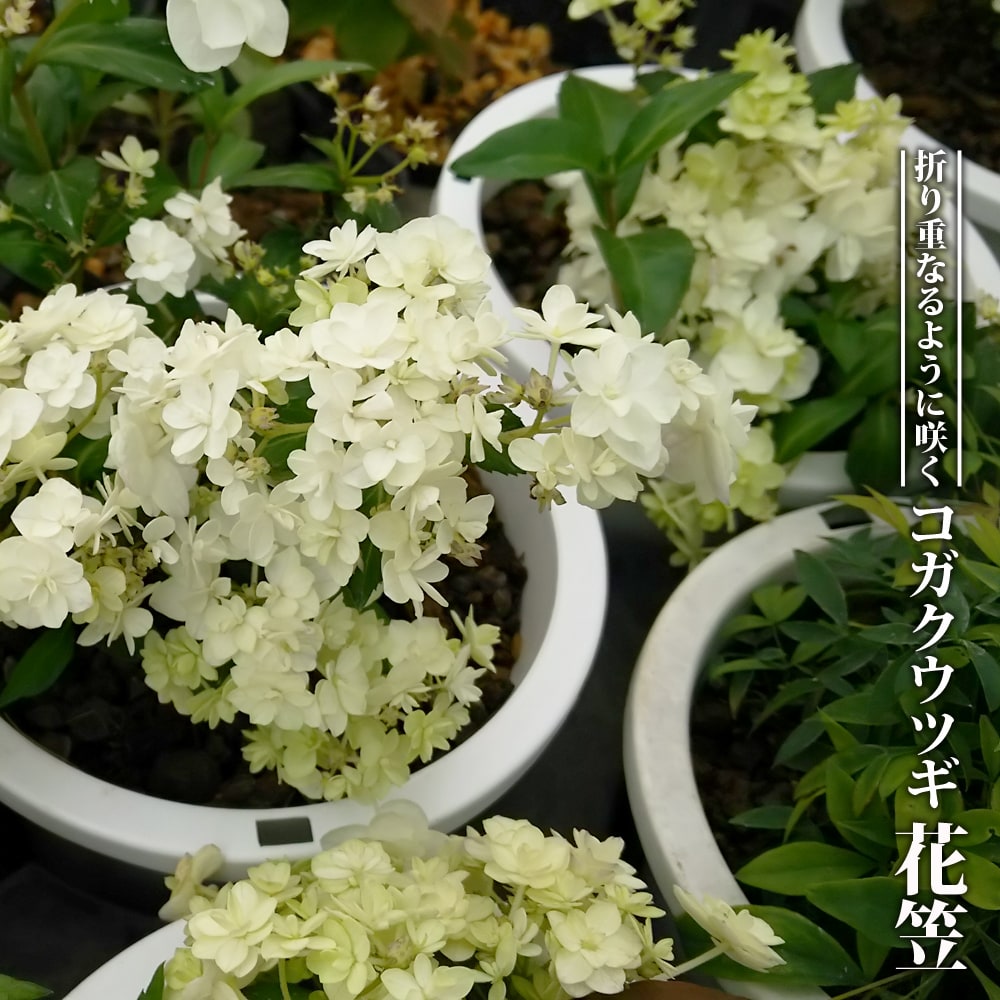 ユキノシタ科のアジサイの一種ですが、ウツギのような姿から「コガクウツギ」の名があります。ガクウツギよりも葉や装飾花が小さめであることが特徴的です。花はアジサイよりも少し早く咲き始めます。