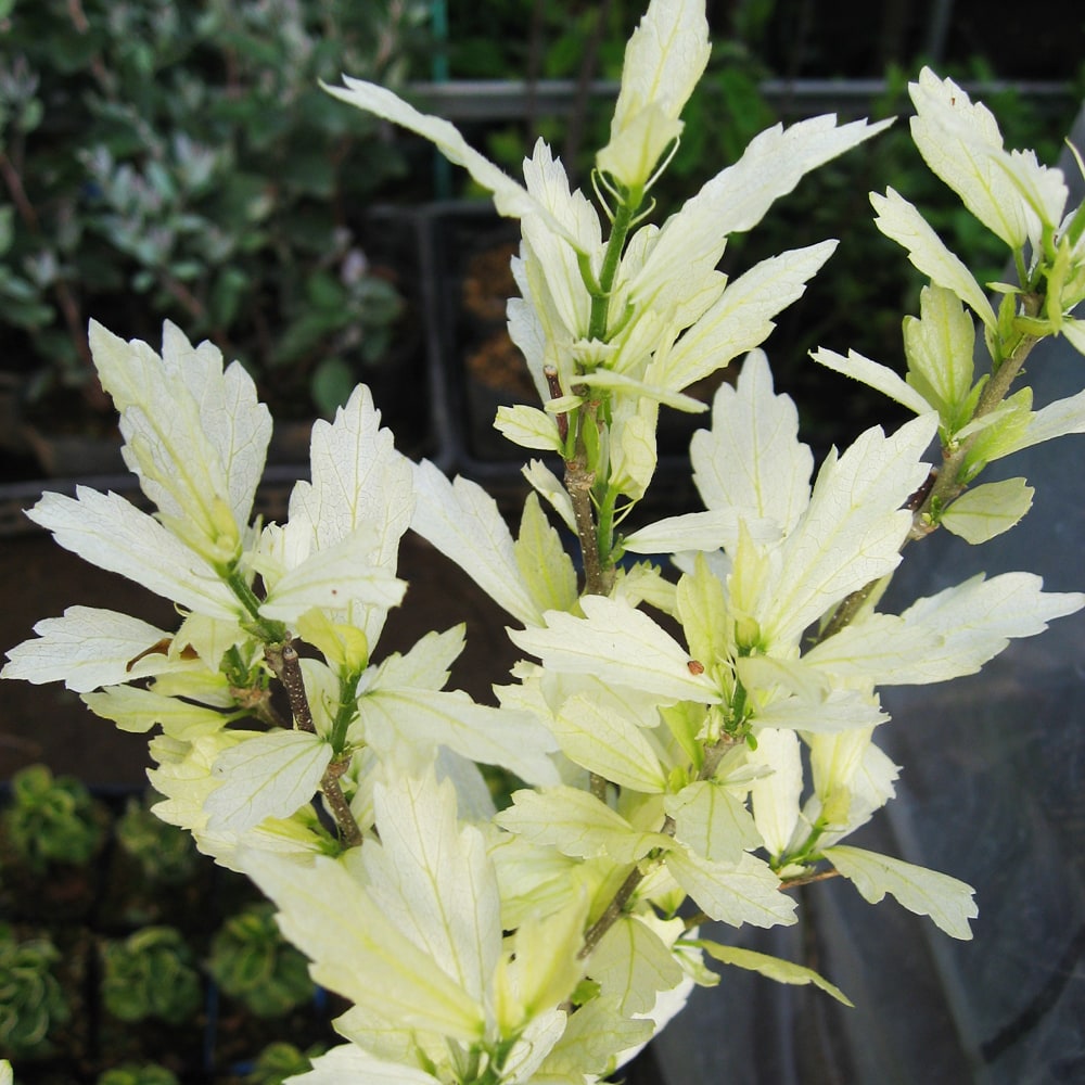 ムクゲ目白の花色は底紅の紫色です。新芽が白芽になりますが、葉が固まってくると緑になります。他は普通のムクゲと一緒ですが、季節の移り変わりにあわせ移ろう葉色を長くお楽しみいただける品種です。