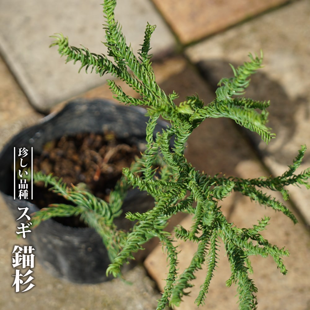 錨杉(イカリスギ)の枝は前後左右に不規則に生じ、枝は垂れ下がって異形となります。当店に入荷してきた錨杉は葉が枝を包むように生えた独特の容貌をしています。大阪市大付属植物園にも植栽されているようです。