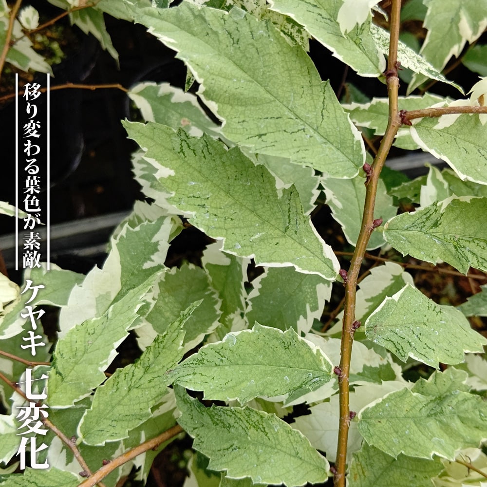 ケヤキ「七変化」は、葉に白フクリン斑が入る美葉品種です。緑色の部分が独特に変化する珍しい品種で、新芽や紅葉時も色が変化します。