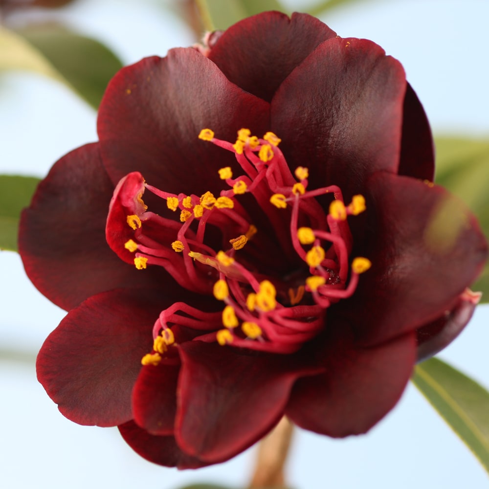 黒椿とは花弁に赤の色素が多く、花の色が黒味がかって咲く品種のことで、渋く気品のある赤黒の椿です。深みのある花色が洋風の庭によく合います。寒さが少し苦手ですので、冬は寒さ避けをお願いします。