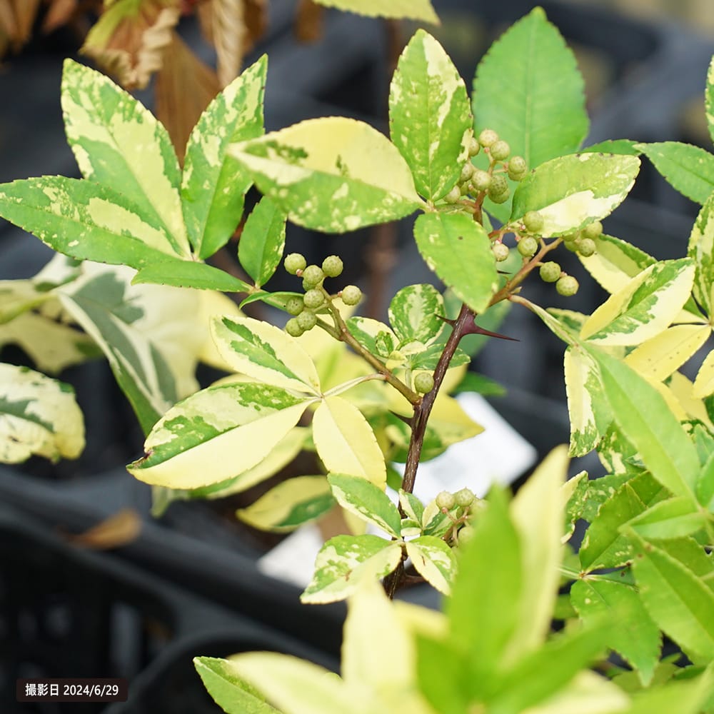 フユザンショウ「斑入」は、葉に鮮やかな黄色い斑が入る珍しい美葉品種です。