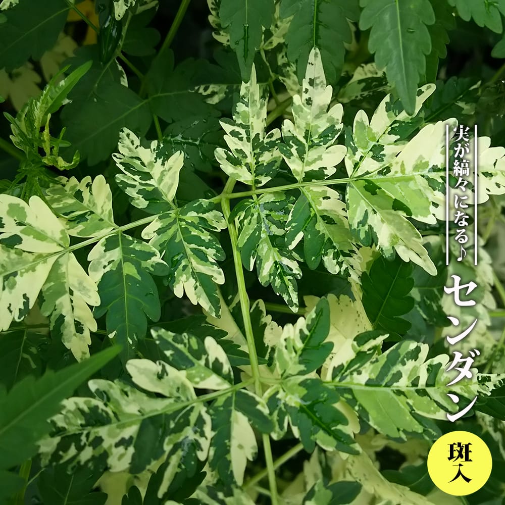 センダン 佐野錦は以前は「斑入」の名前で販売しておりました。2025年9月から佐野錦の名前で販売します。葉に美しい三光斑、白散掃込斑が入る珍しい美葉品種です。実は可愛らしい縞々になります。