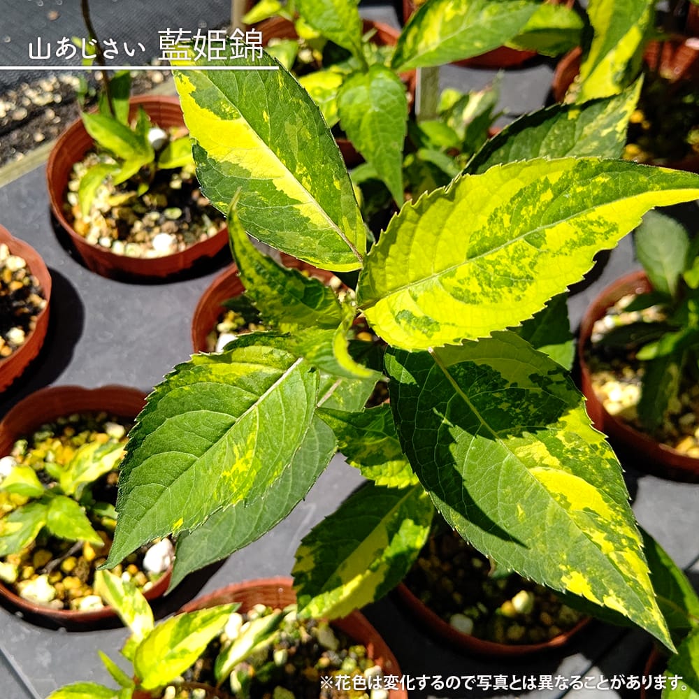 「藍姫錦」は、「藍姫」の枝変わりで黄掃込が入る美葉品種です。花付きがよく、花色も濃いため、花は小さめでも華やかなアジサイ。この品種は葉も美しいので、花がない時期もカラーリーフとして楽しめます。