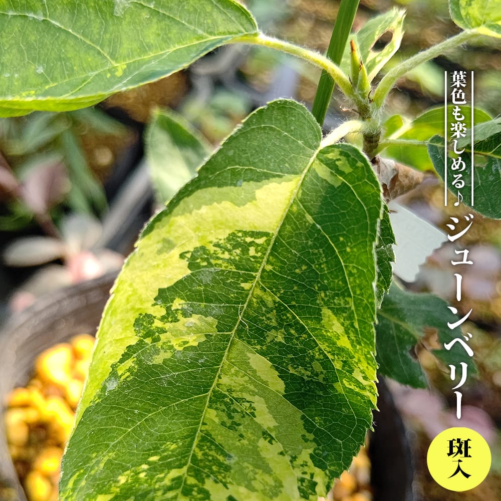 斑入りのジューンベリーなので、花や実がない時期でも美しい斑入り葉が楽しめます。斑は珍しい三光斑が入ります。