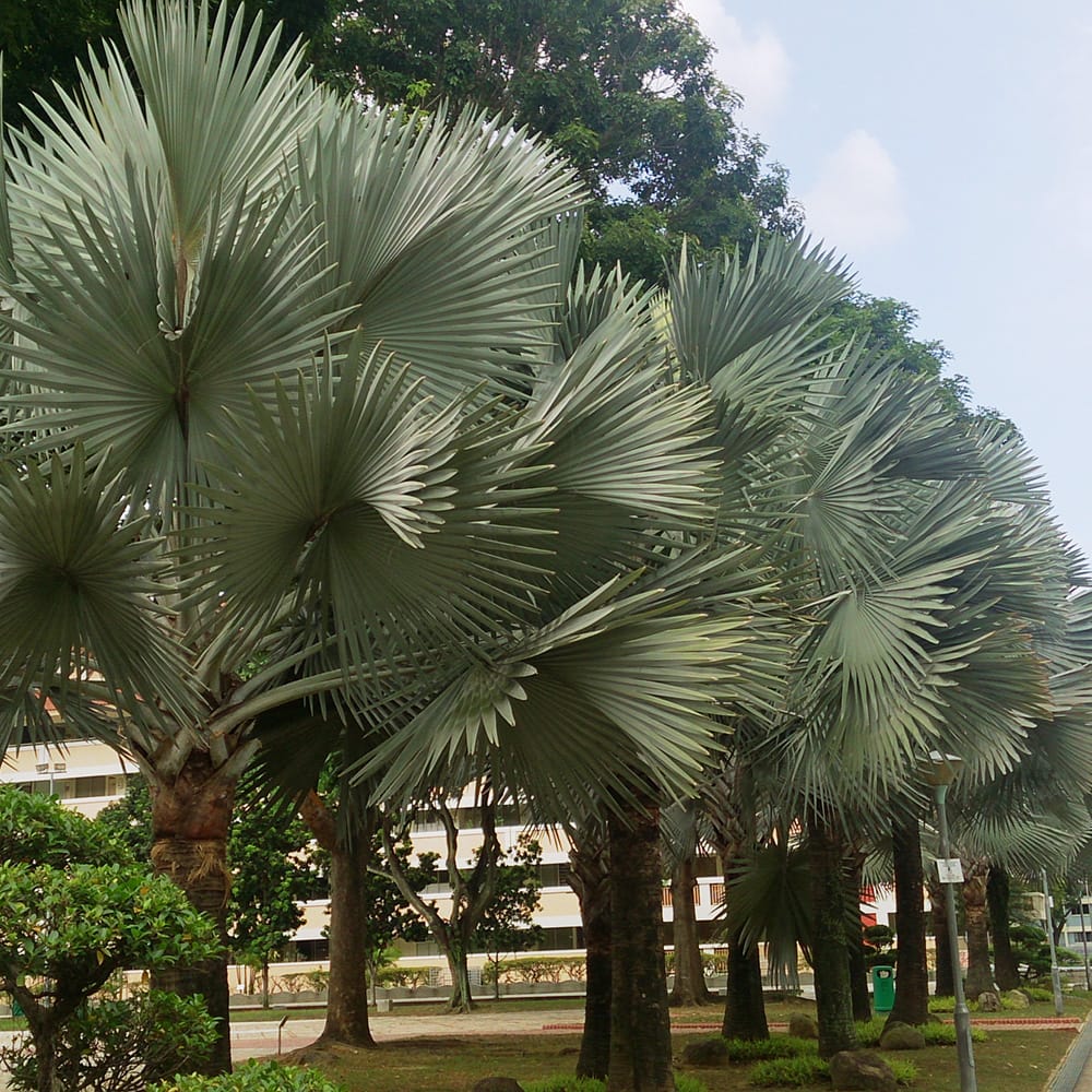 「ビスマルクパーム」はマダガスカル原産のヤシの仲間で、大きな掌状葉の青緑色をしたシルバーリーフが特徴です。マダガスカル原産のヤシで多少耐寒性があります。本来は20mを超える高木?になりますが、一般的な栽培では10~12mで収まるようです。成木になれば耐寒性もあがりローメンテナンスのリゾートツリーです。