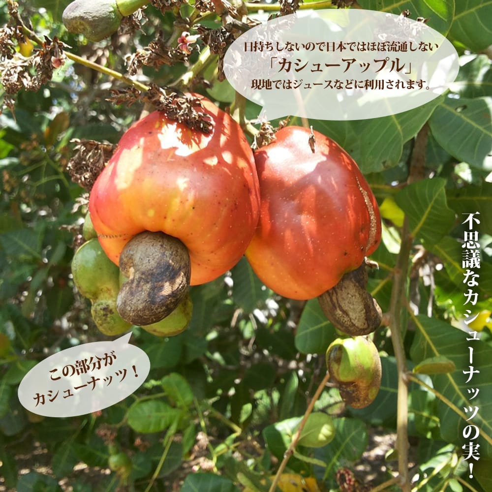 実のような部分は正確には果肉ではなく、花柄部分(果托)が肥大化したもので現地では「カシューアップル」と呼ばれ果物として食べられています。リンゴに似た芳香があり、やや苦みがあるものの甘く多汁で生でもいけます。皮が非常に薄く日持ちしないため日本で生の状態で流通することがない非常に珍しい果物です。