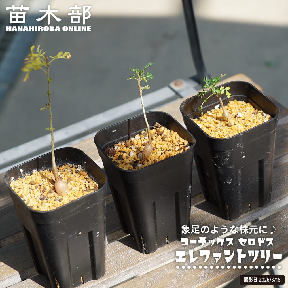 「セドロス エレファントツリー」はカリフォルニア半島に近いメキシコのセドロス島固有の「象の木」です。大きくなると株元の幹が象の足のような凹凸のある幹になるので「象の木(エレファントツリー)」の名を持ちます。鑑賞価値が高い珍しいコーデックス(根塊植物)です。