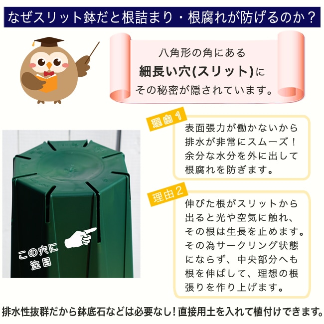 スリット鉢の特徴でもある、鉢角形の角にあけられた細長い穴(スリット)は、丸い穴と違って表面張力が働かないので、水やり時の排水が非常にスムーズ。水やりによって土の中の古い水分が下へ押し流され、植物の根に必要な新しい水と酸素が供給されます。水やり時に排水性が良いことはとても重要なのです。また、余分な水分を外に出してくれる働きもあるので、根腐れも防いでくれます。