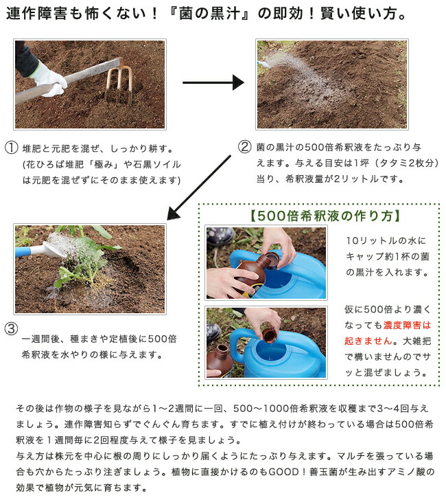 菌の黒汁とは連作障害の改善や植物の生長促進を目的とした光合成細菌を含む菌体資材です。安全で簡単に扱うことができ長期保存を可能にした画期的な商品です。こちらの商品は液体肥料です。すべての植物に対して驚くほどの効果を発揮します。