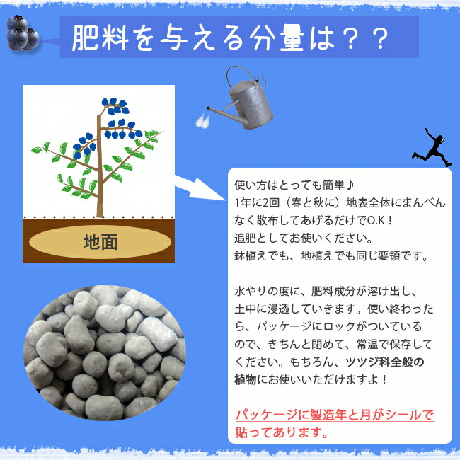 | 適応植物 | ブルーベリー、ツツジ、サツキ、シャクナゲ、アザレヤ、その他のツツジ科の植物。茶の木、ツバキ、パイナップル、マンゴー、ゆり、キキョウなど。 アジサイなどの酸性土壌を好む植物にも効果的です。 |