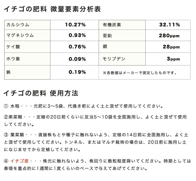 イチゴの肥料は優しい肥料のため、化成肥料や複合肥料との併用も可能です。