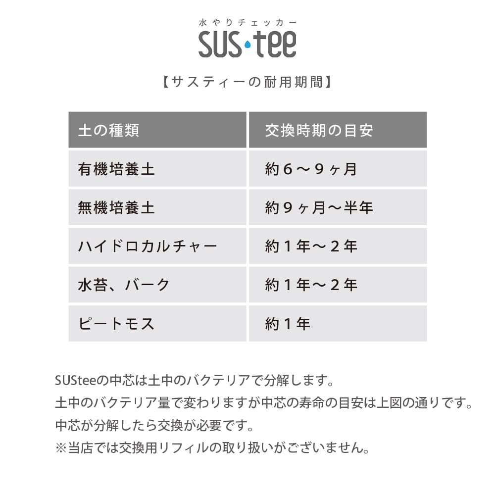 物理的に水分が吸えない状態になっている場合・・・SUSteeは本体下部にある吸水口部から水分を吸水します。この吸水口部が「古く硬くなった土」「根詰まりによる異常な根の量」「極端に粘度のある泥」などで蓋ふさがされてしまっている場合、水が吸えなくなり変色できない場合があります。SUSteeを挿す前に少し土をほぐしたり、挿す場所を変えると改善する場合があります。