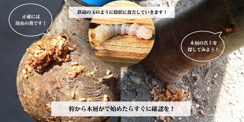 幹や株元、枝や株の周りに糞混じりの木くずが落ちていたら、テッポウムシの幼虫がいる可能性があります。