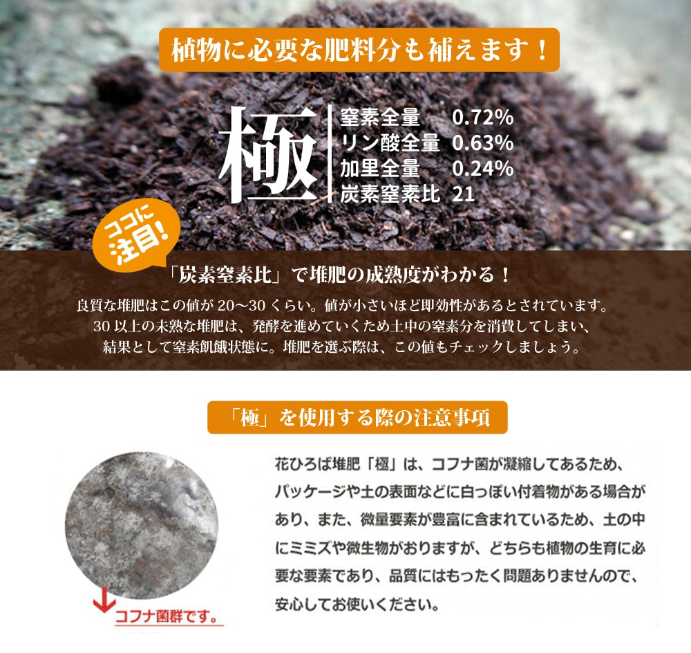 A:花ひろば堆肥 「極」は、栗東のサラブレッドのトレーニングセンターから出た、馬糞やウッドチップを使用しています。汚泥・建築廃材等は一切含みません。こちらに有用微生物菌群を加えた秘密のブレンドで堆肥化を行っております。牛や馬の糞を利用した堆肥は、匂いが少ない緩行性肥料としても重宝されます。さらに、こちらの「極」は1年以上かけて熟成させているので、匂いも気にならず、炭素窒素比も20前後と低いのが特長です。