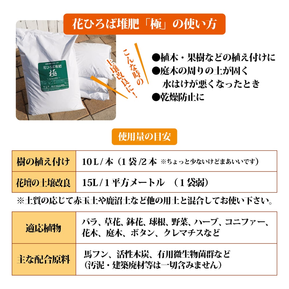 | 地植え栽培時の土壌改良に使います。 果樹・庭木・バラ苗などでは1株の植栽に10リットル使います。1袋全量使っても肥料やけしません。もとの土壌によく混ぜます。 草花・野菜などの花壇・畑での土壌改良では1平米につき1袋使い、もとの土壌によく混ぜます。 |
