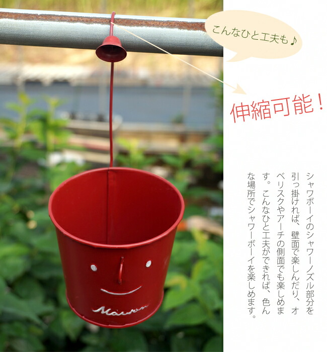 ◆商品の特徴:ブリキポットの「シャワーボーイ」かわいいデザインがお庭やお部屋をホッコリさせてくれます。シャワーノズル部分を引っ掛ければ、壁面や、オベリスク、アーチでも楽しめます。◆商品のサイズ、カラー:水色、ベージュ、赤色の3色からお選びください。S,Mサイズがあります。【Sサイズ】直径:10cm、高さ:9cm (3号ポットサイズの苗が収納できます)【Mサイズ】直径:12cm、高さ:11cm (4号ポットサイズの苗が収納できます。)◆お届けについて:20個までなら小梱包、40個までなら通常梱包でのお届けになります。41個以上のご注文で、送料が2梱包になります。※こちらの商品は、他の商品とも同梱できます。
